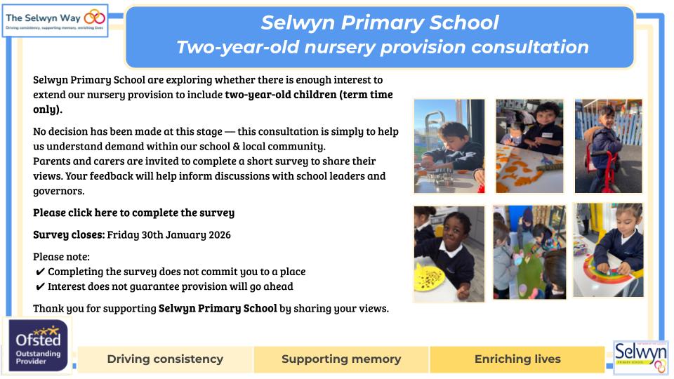 Selwyn is a happy and successful school located in Plaistow, East London. We are at the heart of this culturally rich community where we are able to offer purposeful and exciting learning opportunities for all. Everyone within our learning community has high aspirations and we work hard to make learning fun and relevant to each individual.