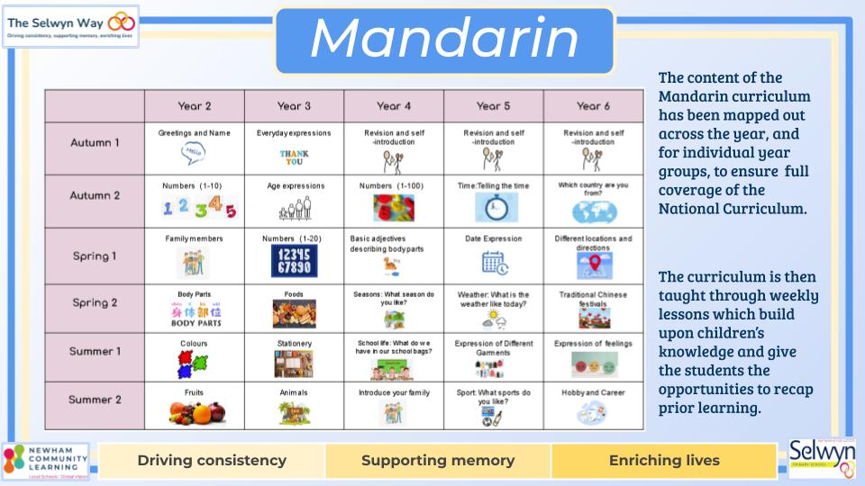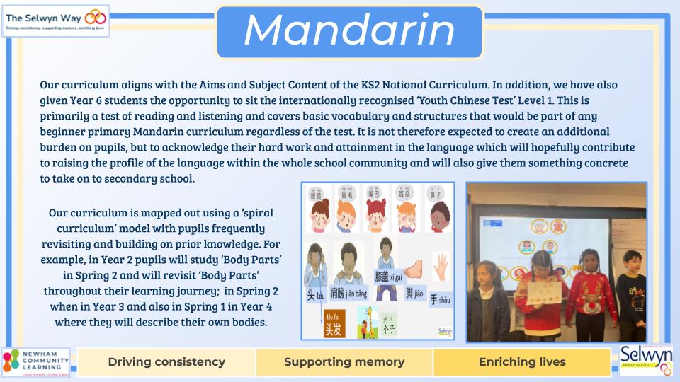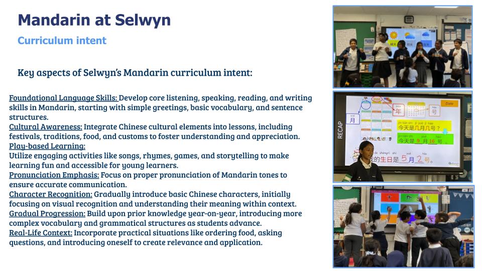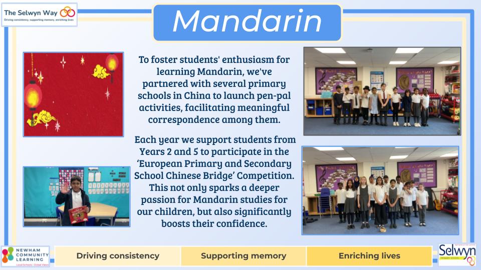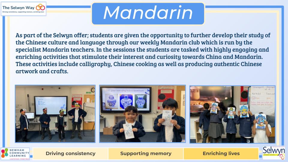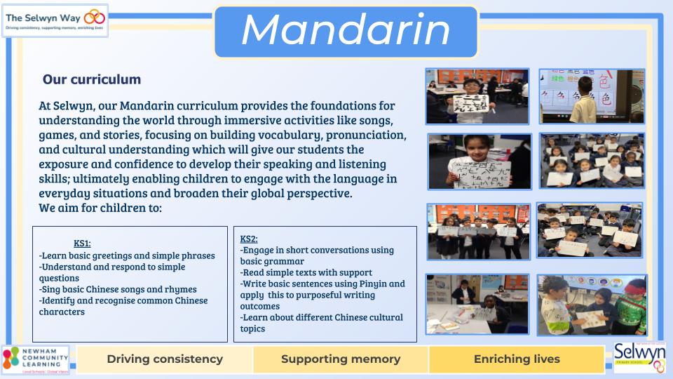 At Selwyn, Mandarin is taught across KS1 to KS2; to students in Years 2- 6 by specialist Mandarin teachers. Our intent is to fire pupils’ curiosity to gain a knowledge and understanding of the language of another culture and in turn offer them a comparison of their own. We aim to equip students with basic communication skills in Mandarin through immersive activities like songs, games, and stories, focusing on building vocabulary, pronunciation, and cultural understanding while fostering confidence in speaking and listening, with a gradual introduction to reading and writing Chinese characters. All while developing an appreciation for Chinese culture through themed lessons and celebrations; ultimately enabling children to engage with the language in everyday situations and broaden their global perspective.